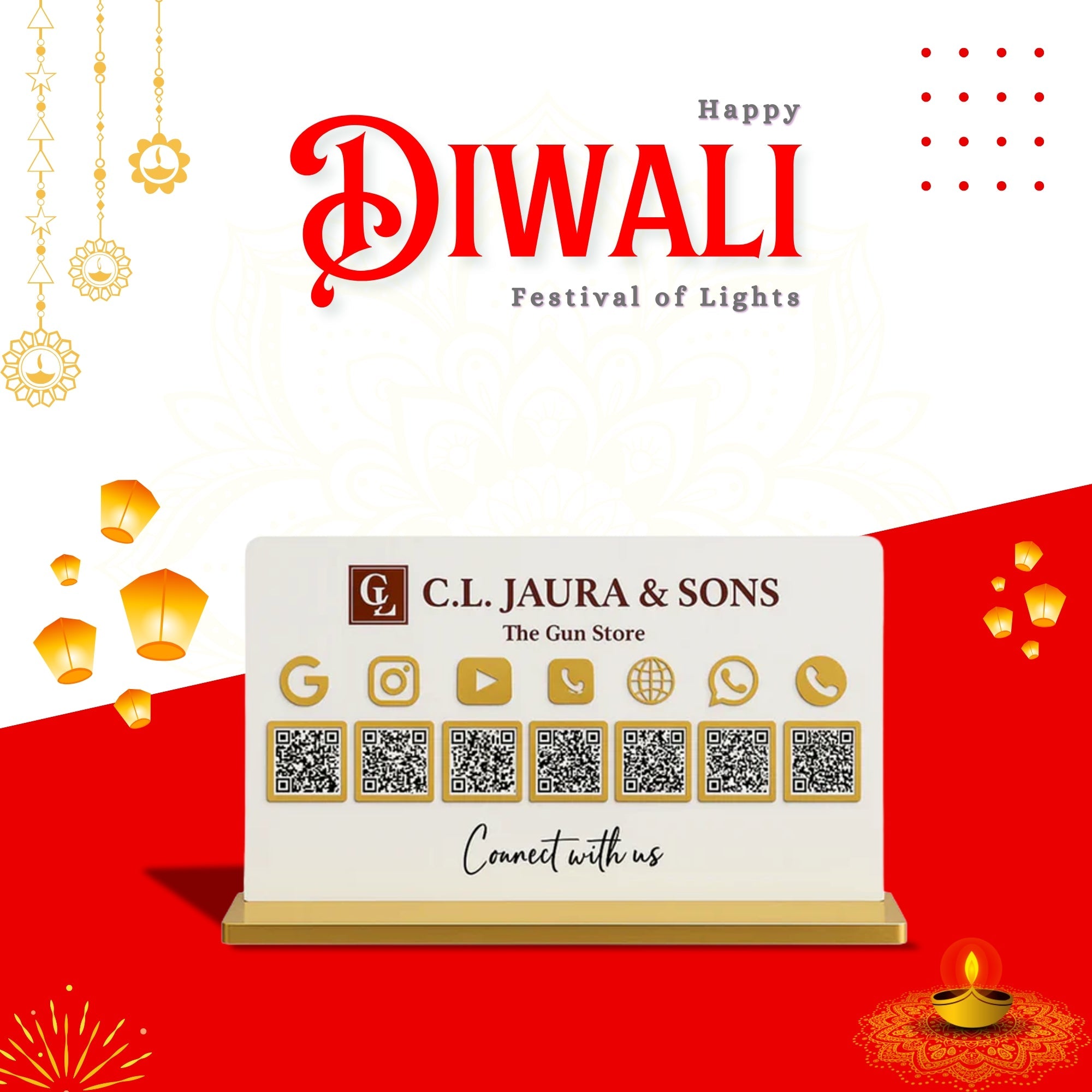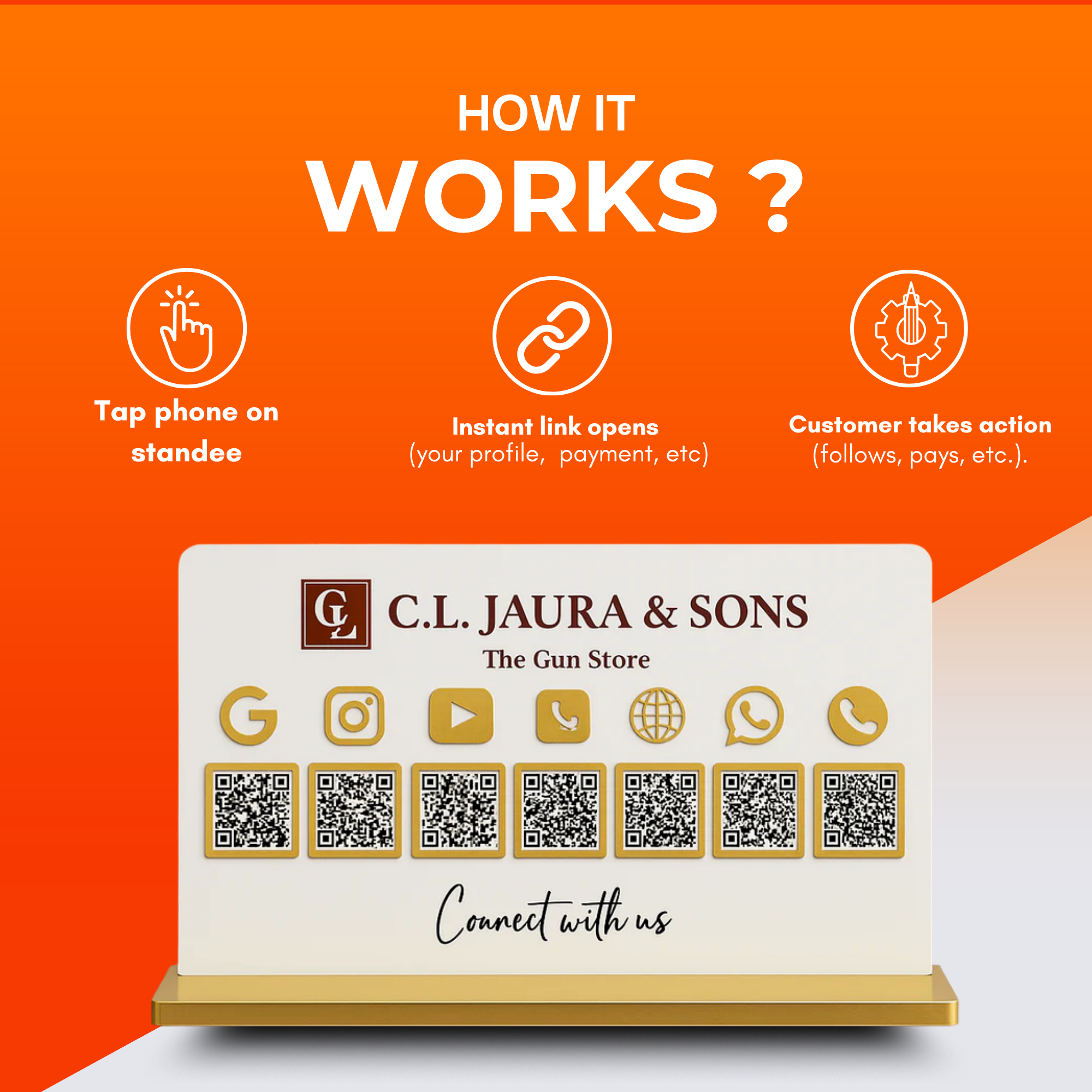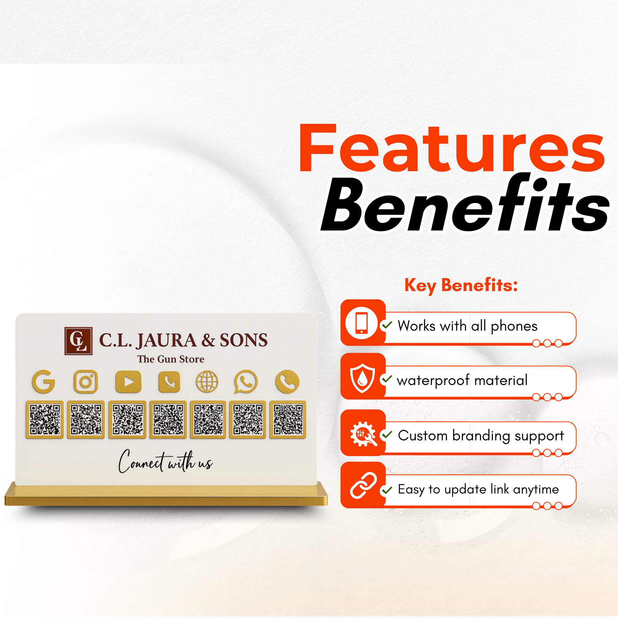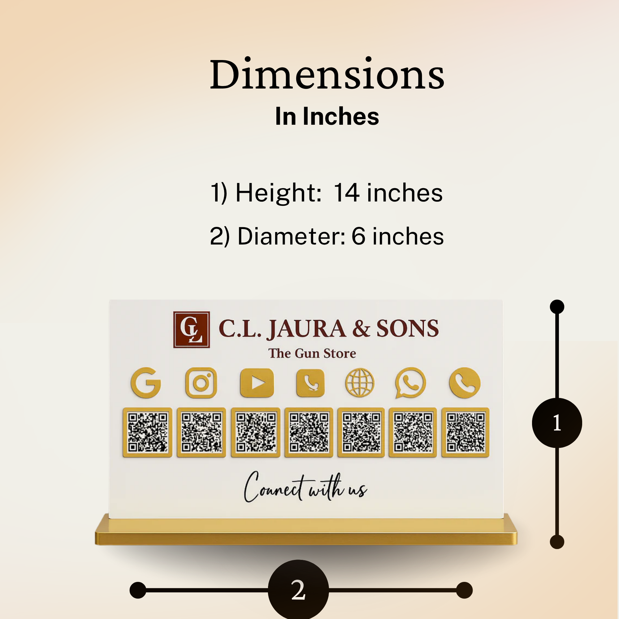 Level up your counter space with this elegant, all-in-one QR code stand. Designed to connect your business across platforms like Google, Instagram, YouTube, WhatsApp, Website, and Phone, all from a single point.