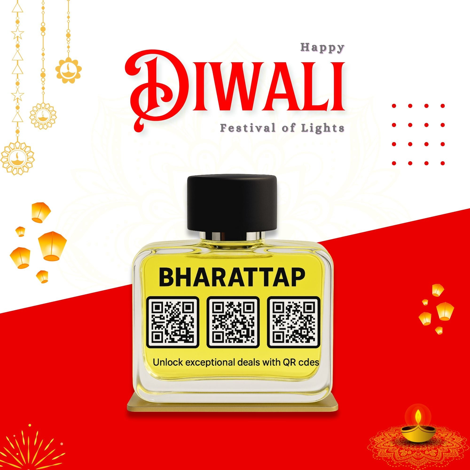 Add a unique, eye-catching touch to your counter with the Bharattapp Perfume Bottle QR Standee. Shaped like a premium perfume bottle, this standee features three QR codes to help your customers unlock exclusive deals, offers, and instant connections with a quick scan.