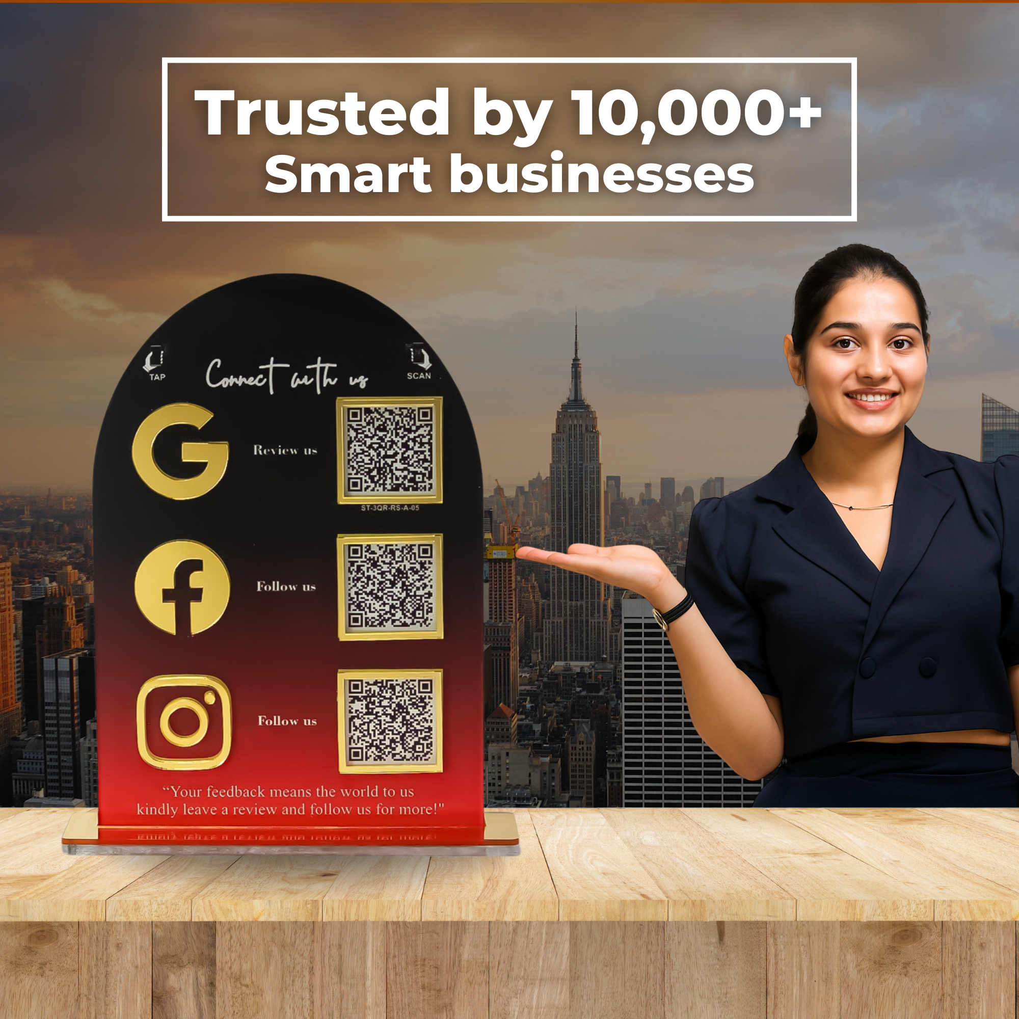Upgrade your counter with this elegant QR stand featuring quick links to Google Reviews, Facebook, and Instagram. Designed with a stylish black-red gradient and gold accents, it adds a premium touch to your business.